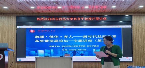 2024年10月26日下午,体育学院开展润疆·健体·育人——新时代丝路体育高质量发展论坛专题讲座(第九讲)。此次学院邀请华东师范大学孙有平教授进行授课,学院全体研一、研二学生参加此次讲座。本次讲座由体育学院党委副书记、院长马嵘主持。