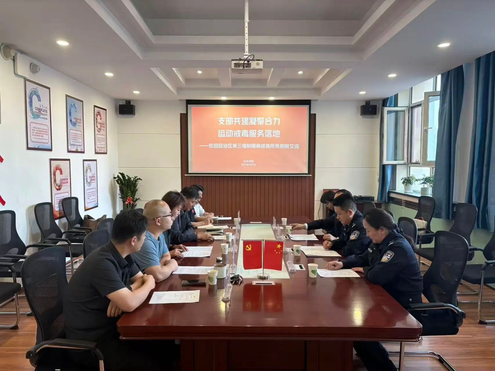 前期,体育学院教师第一党支部作为全国党建工作样板支部与自治区第三强制隔离戒毒所第一党支部开展了共建活动。在此基础上,双方以“运动戒毒”主题开展深入座谈交流,探讨进一步长期稳定合作。体育学院发挥学科优势与戒毒矫正相结合,开创运动戒毒的服务新途径。